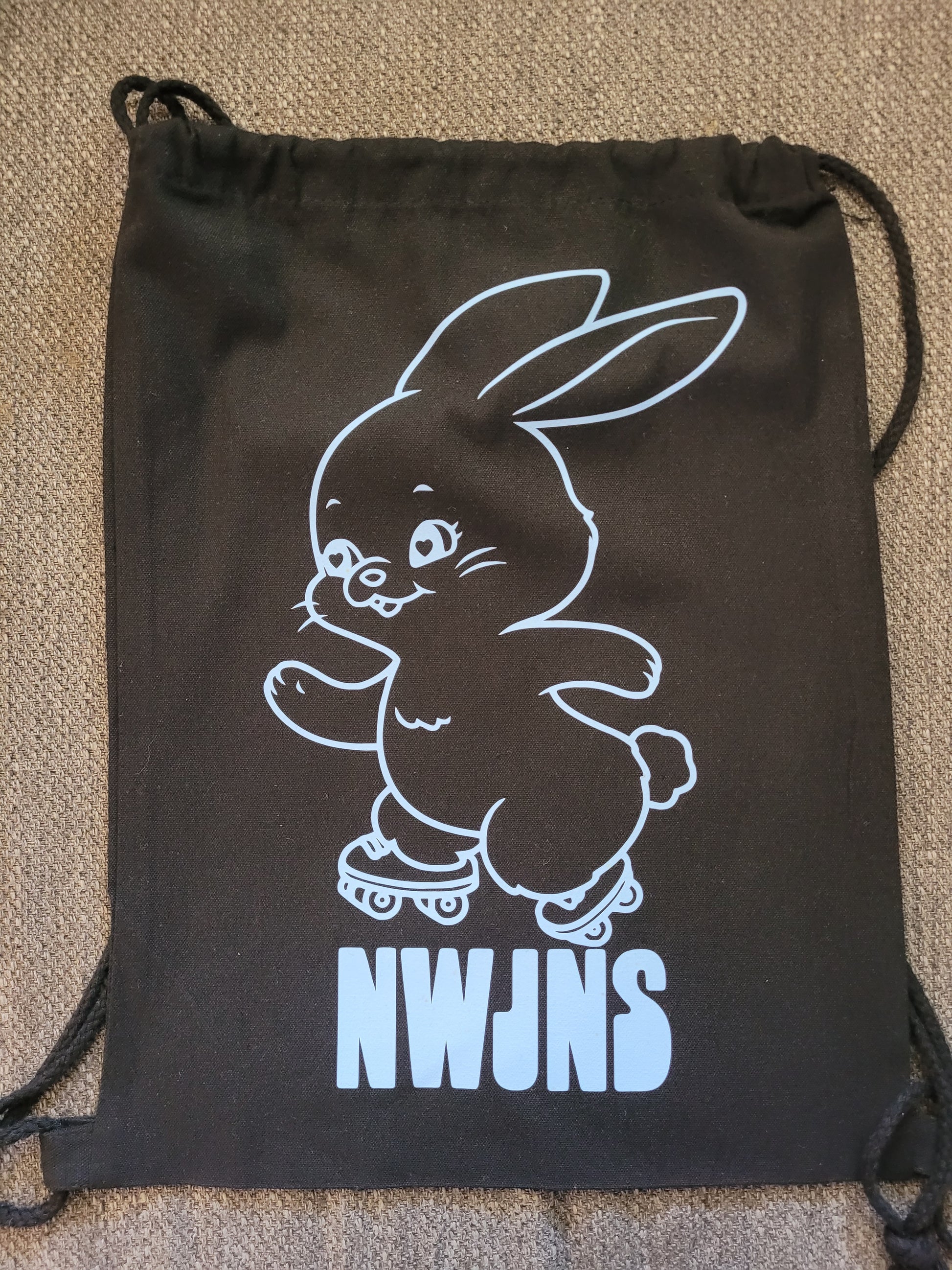 NEWJEANS drawstring backpack black with light blue vinyl.